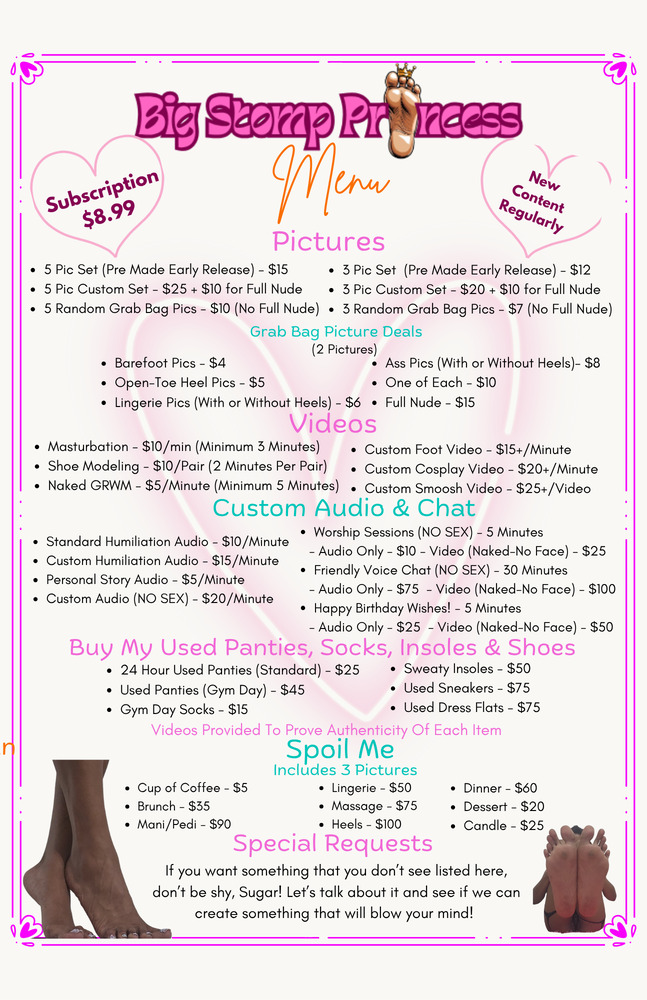 Hey! I'm a sexy Ebony with BIG US 11 sized feet and a gorgeous body that I LOVE to show off! For my feet lovers, please know that I can go weeks to months between pedicures for content purposes unless I'm fulfilling requests, which are ALWAYS WELCOME! So, if you want to see super pretty toes all the time then you may have to be willing to negotiate. All rates and services are included in my Menu so feel free to peruse that to get an idea of what you might like. I do accept custom requests outside of the menu but they are on a case-by-case basis. Don't be shy though, I might be into what you're into!! I'm passionate about fetish modeling, playing dress-up, living authentically, having AMAZING sex, putting little subs and bugs in their place and generally sharing naughty stuff with fellow kinksters! I truly enjoy what I do, so you can expect to be spoiled with new content regularly!! I'll expect you to spoil me in return!! XOXOXO